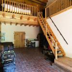 Etage: Grote slaap/lounge kamer (58m2) met houtkachel, wc, douche.