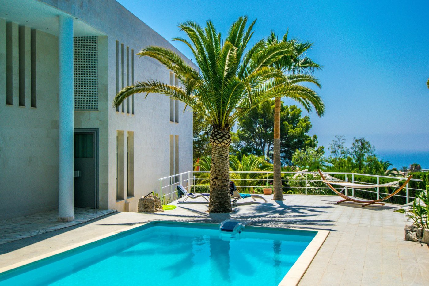 Modern style villa with private pool and sea views located in a quiet urbanization very close to Altea la Vella. This villa was built in 2004 on a 1,080m2 plot and it has a large double-height living-dining room with a staircase that leads to an open office on the first floor. Downstairs is also a fully equipped independent kitchen, washing room, exterior bathroom with shower and a large bedroom with bathroom en-suite. All the doors on the ground floor are wide enough for wheelchair access. On the first floor, there is a hall, which is also opened to the double-height living-dining room and two double bedrooms with bathroom en-suite. From this floor, there is access to the roof, which can be easily converted into a solarium with amazing sea and mountain views. From the washing room, there is a staircase that leads to the basement. On this floor there are two extra rooms that may be converted in a playroom or cinema, garage for two cars and extra room for storage. This villa is sold furnished and it is finished with top quality materials: water softener and drinking water filter system, marble floors, mosquito nets in all the windows, central heating, hot water with closed recirculation circuit, salt filtration system for the pool, etc. The pool is located on a corner and has two entrances. On the main entrance, there is a large parking area for several cars that leads to the pool terrace and the BBQ area. The property also has a mature garden with fruit trees (apple tree, pear tree, fig tree, orange tree, etc.), palm trees and other Mediterranean trees. The second entrance goes directly into the garages.