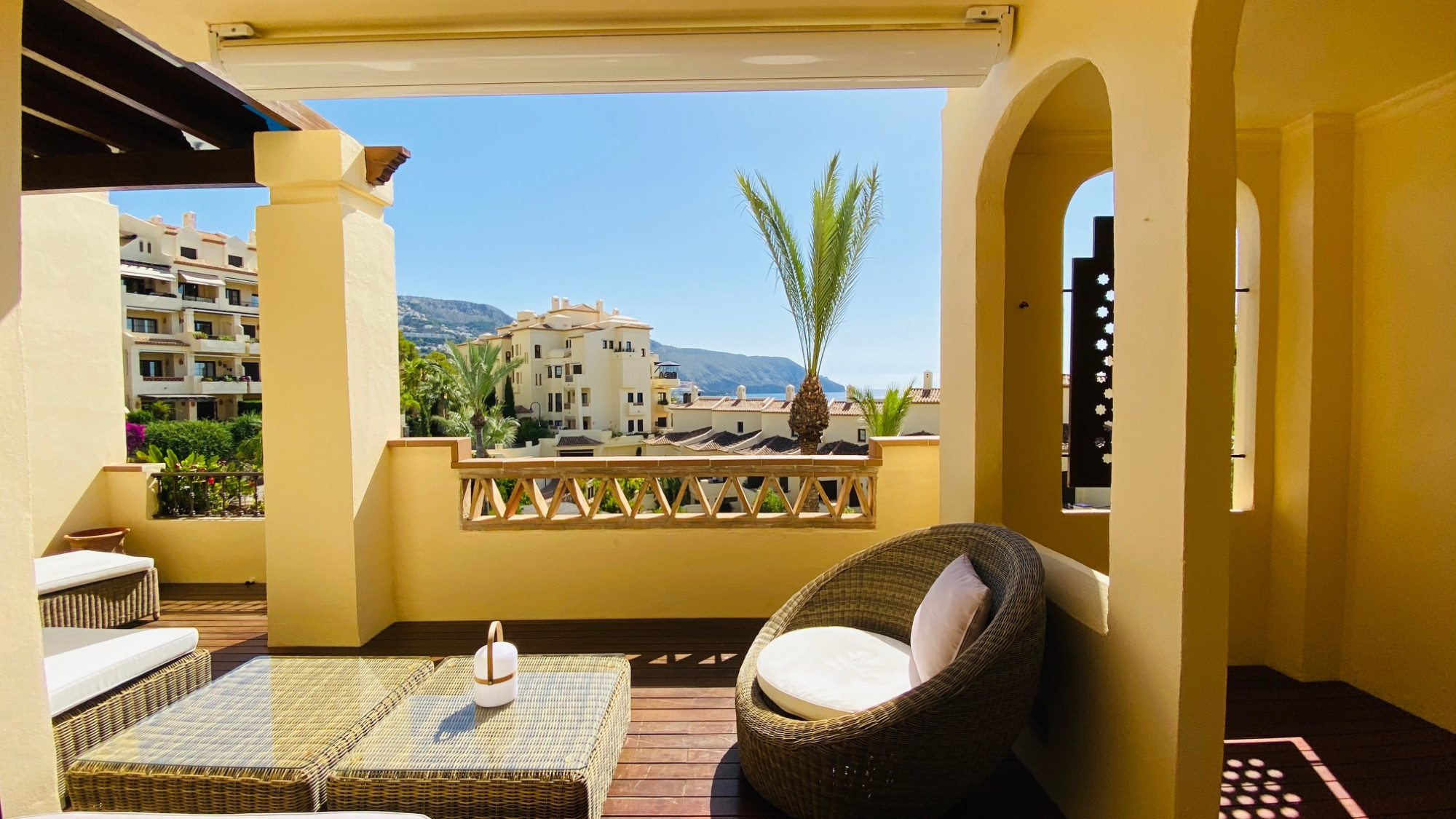 Beautifully located apartment with sea views located in one of the most luxurious complexes on the Costa Blanca, right on the beach and with tropical communal gardens and no fewer than 10 communal swimming pools. The apartment has an entrance, kitchen with utility / storage room, spacious living room with sliding doors towards the terrace which is partly covered and offers a Jacuzzi, 2 bedrooms and 2 bathrooms. The master bedroom has an en suite bathroom and access to the terrace. The apartment is sold including a parking space in the underground garage.