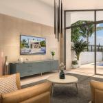 The last of this beautiful new-build project of 5 semi-detached houses is now offered turnkey. That is why this house is equipped with all white goods, all furniture and air conditioning for this price. You only need to bring your clothes. This beautiful bungalow has a private pool, 2 bedrooms and roof terrace. The undulating roof gives space in the living room. Finished with light and beautiful materials.
