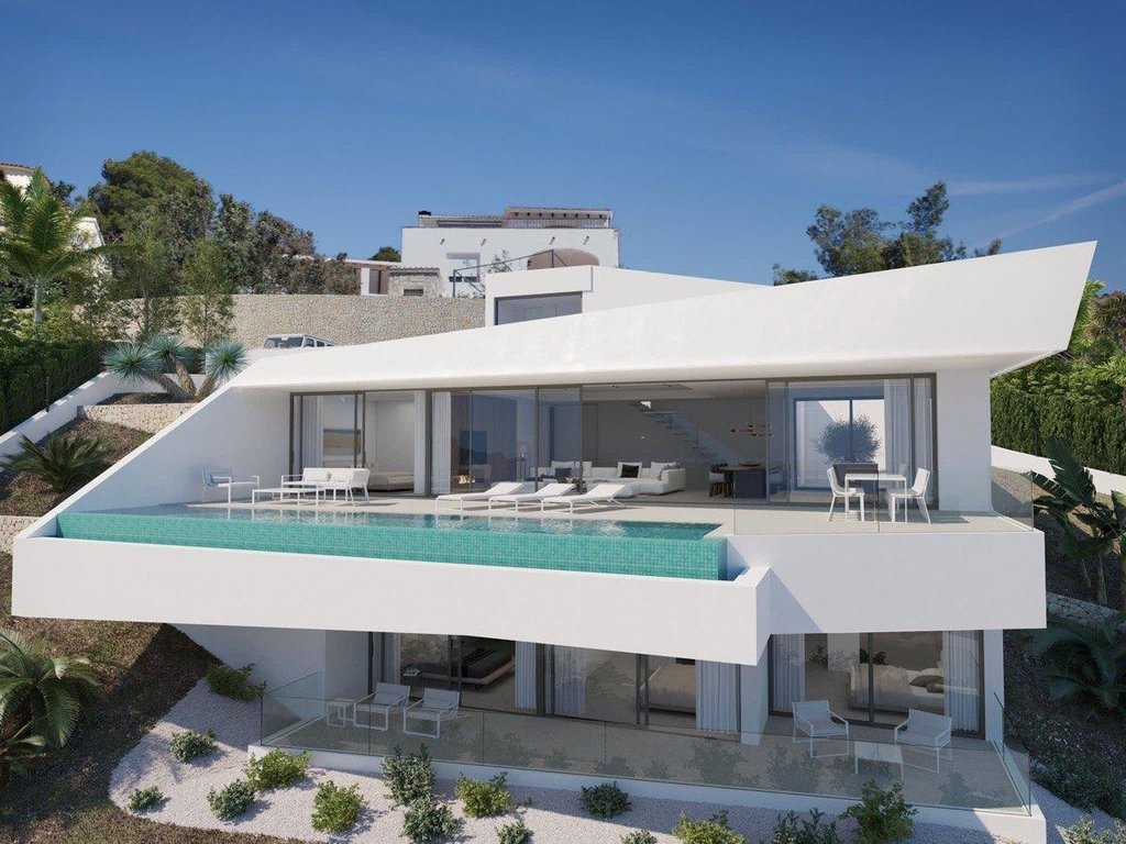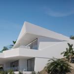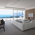 This modern design villa is under construction and is located on a beautiful plot with panoramic views over the coastline towards the rock of Calpe. The house will be ready in the summer of 2022 and will have 2 residential floors plus an access floor on the top level, all connected by an elevator and internal stairs. The house has a living area of 373 m2 and on the ground floor a very large living/dining room with large sliding glass doors to the terrace and desing pool. There is also an open plan kitchen and spacious bedroom with en suite bathroom on this level, as well as a guest toilet. One floor down are 3 more bedrooms with private bathrooms. All rooms of this house have sea views and the house will be finished with high quality materials including floor to ceiling interior doors and frames, underfloor heating and air conditioning.