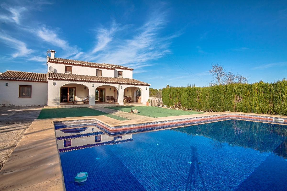 This 300 m2 big finca that was built in 2004 is located in a quiet area in Benissa and lies on a flat plot of nearly 14000 m2. Through an entrance hall, you reach the bright living / dining area and the separate spacious kitchen. On this level there is also a guest toilet and the master bedroom with bathroom en suite. On the upper floor there is a large lounge area that is currently used as an extra sleeping zone, a bathroom and 2 more bedrooms. The living space on the ground floor has big windows and doors that give access to a covered terrace from where you reach the swimming pool of 5m x 11m and the huge terrain. The house is very well maintained and ready to move in. Extra: underfloor heating, automatic gate, double garage and double carport.