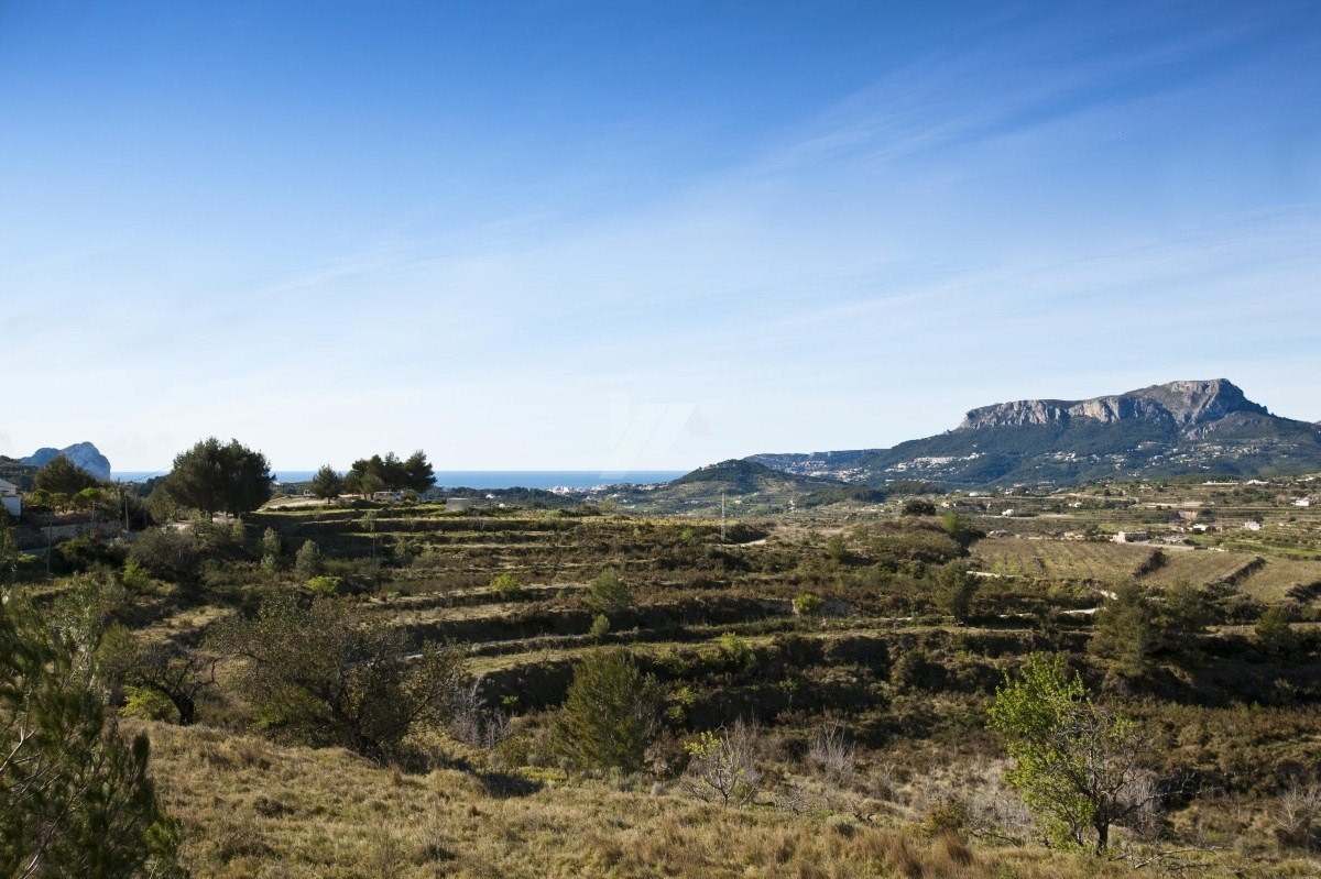 Large building plot for sale in Benissa with spectacular views of the sea, the rock of Calpe and Bernia mountain of Altea. A quiet location, with easy access into the town of Benissa and motorway exit. With the possibility to build 2% over 2 levels with a pool.  There are 2 different locations on the land to position the property for maximum sun and views. Water and electric are nearby. Plans already drawn up for a property of 240 meters distributed over two levels with a 12x6 meters pool. Casita already constructed on the land and a 50,000 cubic liter water deposit.