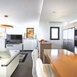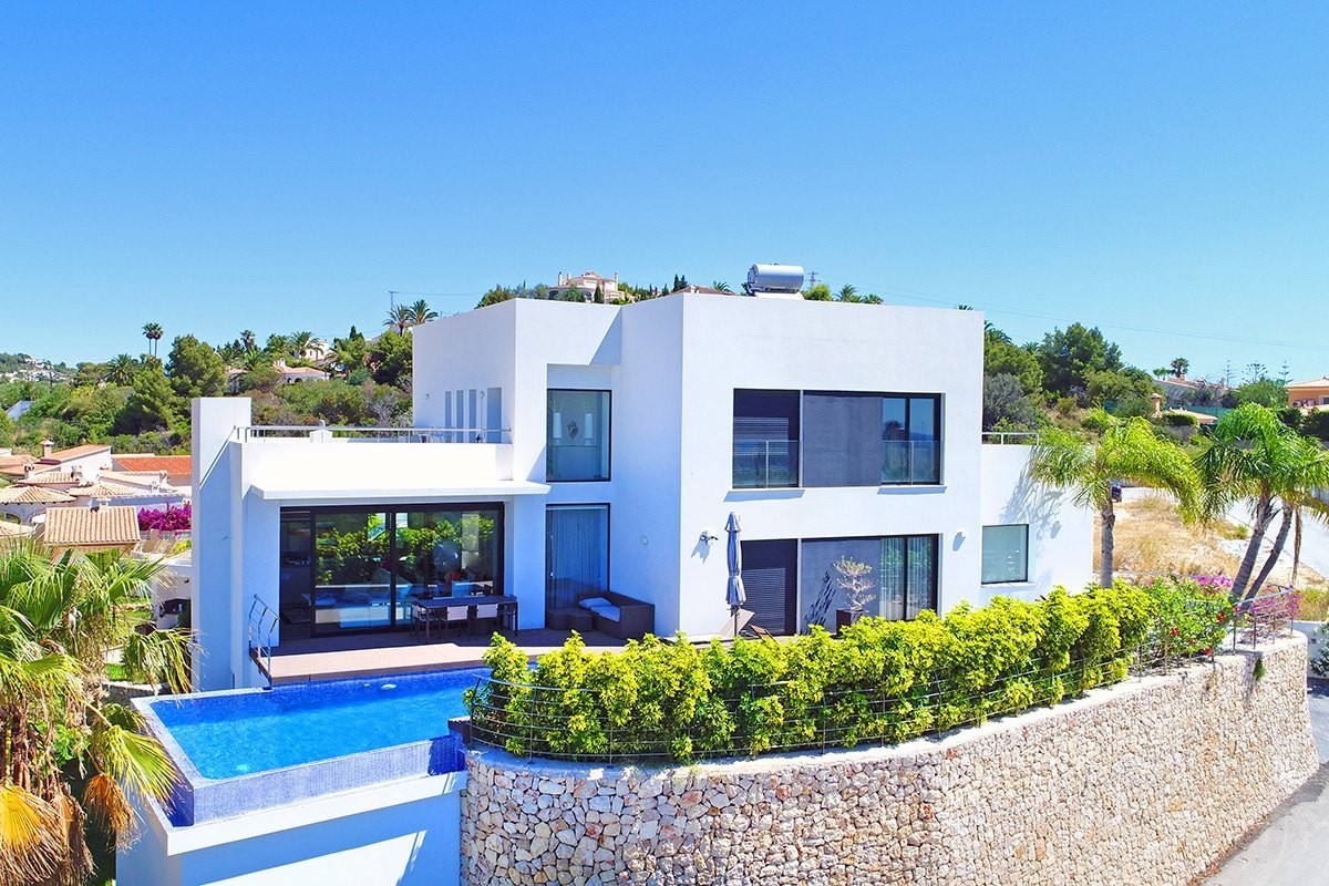 This modern villa with views to the sea, mountains and Peñon de Ifach is situated in a prestigious, quiet location, near the city center, shops, restaurants and beaches. The villa is distributed over three floors: the ground floor consists of one bedroom, one bathroom, laundry room and a music room. The first floor consists of two bedrooms, two bathrooms, a living/dining room with open kitchen, this floor also includes the swimming pool, terrace, barbecue area and easy maintenance garden. The second floor consists of two bedrooms and one bathroom. The villa specification includes furniture, Miele appliances, air conditioning, underfloor heating in bathrooms, automatic window shutters, automatic irrigation system and an alarm system with surveillance.
