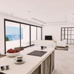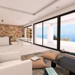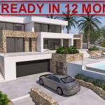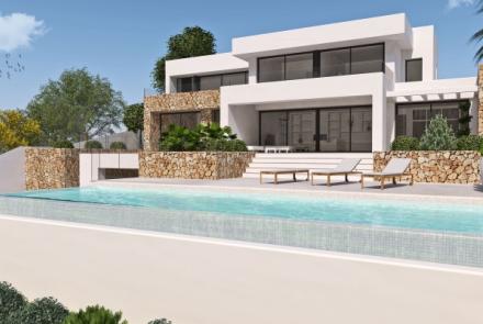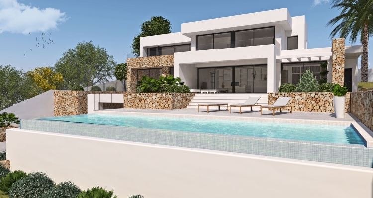 Modern new build villa with sea view for sale in Moraira, located in a quiet street, south facing and at 130m from the sea. The house can be adjusted to your own choice, currently there is an entrance hall, guest toilet, living room with open kitchen and utility room, 4 double bedrooms, 3 bathrooms and a double garage. Outside there is a self-cleaning infinity pool, a covered terrace, a maintenance-friendly garden and parking spaces.