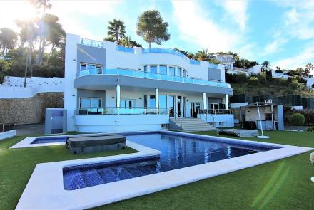 This beautiful modern villa is located in a quiet and green area and offers a beautiful view over the bay of Javea and the Montgo. The villa is divided over 3 floors. On the ground floor there is a spacious bright lounge with dining area, a modern fully fitted kitchen, a guest toilet, a laundry room and a double bedroom with bathroom en suite. On the first floor there are 2 double bedrooms, a bathroom, a double bedroom with bathroom en suite and the spacious master bedroom with dressing area and bathroom en suite. In the basement of the villa there is a games room with lounge, bar, billiards, Jacuzzi, sauna and bathroom. Here you will also find access to the spacious garage which is suitable for 7 cars. In addition to the terrace with swimming pool and the beautifully landscaped low-maintenance garden, there is a covered barbeque area and a second Jacuzzi.