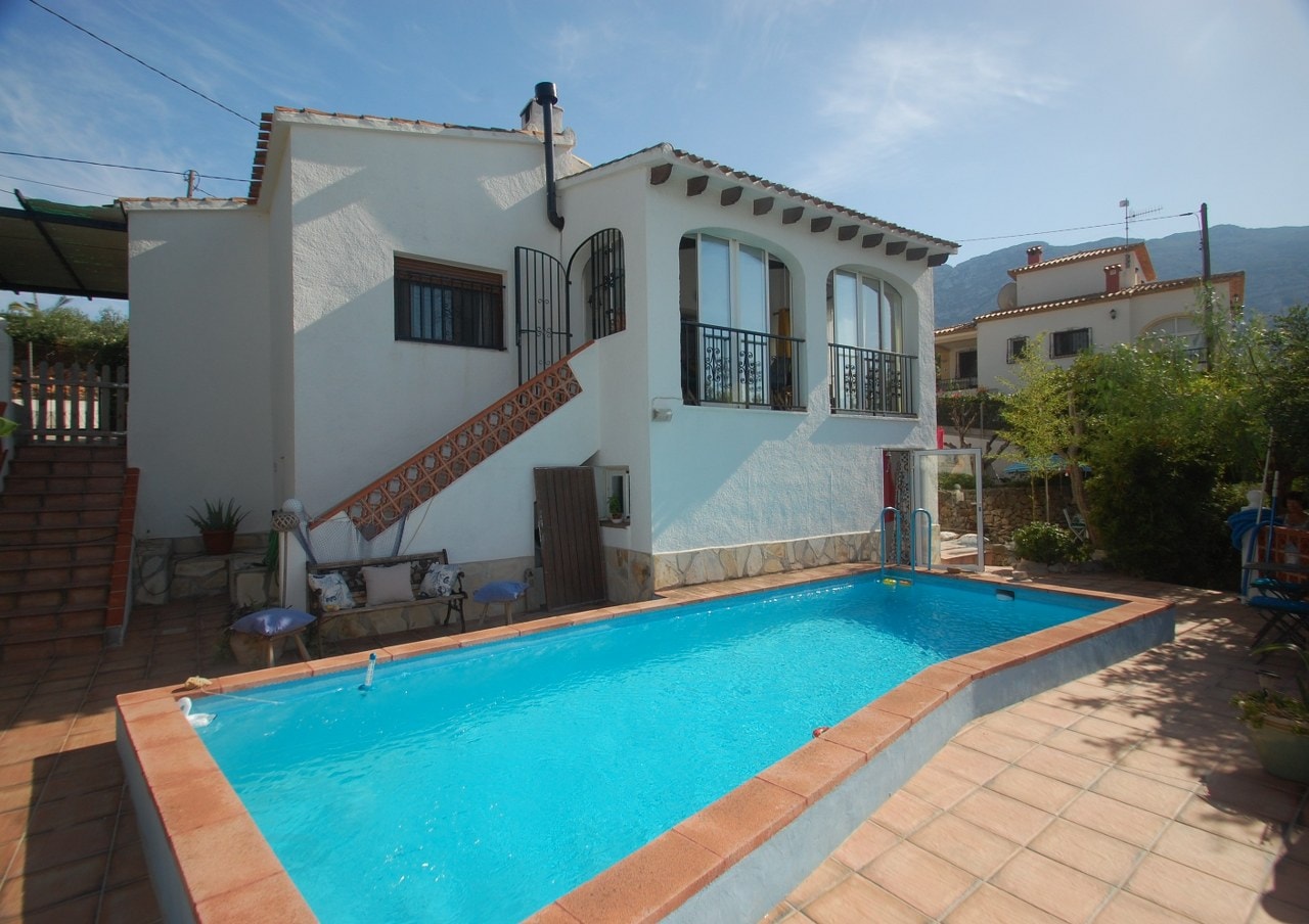 This beautiful villa is located in a quiet residential area in Denia and is only 2 km from the sea and 4 km to the center and all amenities away. The house was renovated in 2017 and was built on 2 levels. In the superior floor there is 1 bedroom, 1 bathroom with shower, a spacious living and dining room, as well as an open kitchen and a large open terrace. On the ground floor there are 3 further bedrooms, 2 bathrooms with bathtub, 1 further living and dining room, a closed kitchen, a laundry room, a glazed terrace and a covered terrace. The villa also has a roof terrace with breathtaking sea views! There are many extras, such as a 6.5 mx 4.5 m pool, satellite TV with satellite dish, summer kitchen, BBQ, built-in cupboards, wood-burning fireplace, air conditioning (h / c), electric water heater, and double-glazed windows with aluminum frames, shutters as well as security bars and mosquito nets. In addition, the property has a carport for 2 cars. The house is being sold partially furnished and with some electrical appliances.