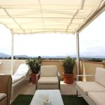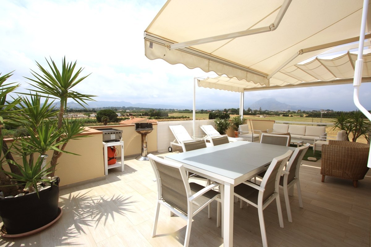 Bright penthouse for sale with fantastic panoramic views of the mountains. Third floor with elevator. Spacious living - dining room with exit to 65 m2 of open terrace with south - west orientation, open kitchen, 2 bedrooms both with fitted wardrobes, 2 bathrooms and 1 toilet. To note that currently the third bedroom has joined the living - dining room but it would be very easy and inexpensive to refurbish it again as a bedroom. Property completely renovated in 2018 with the best materials on the market, has air conditioning, fully equipped design kitchen, gres and laminate wood floors, awnings etc... It is sold partially furnished and included in the sale price is a parking inside the complex. The small and quiet urbanization is next to all services in Las Marinas km 4,5 to Dénia town.