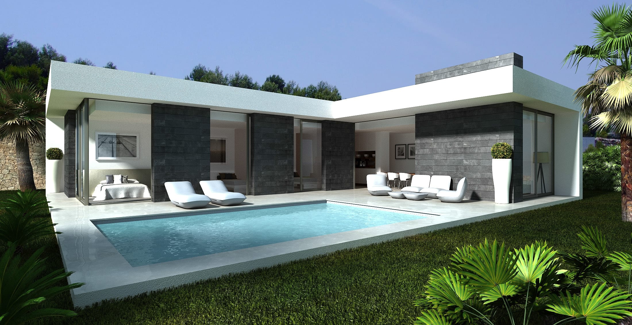 Model Formentera. Deze moderne villa kan worden gerealiseerd binnen 12 maanden. Er zijn diverse percelen beschikbaar tot een oppervlak van 1530m2, met ofwel een open uitzicht op de vallei en het berglandschap of met uitzicht op zee.