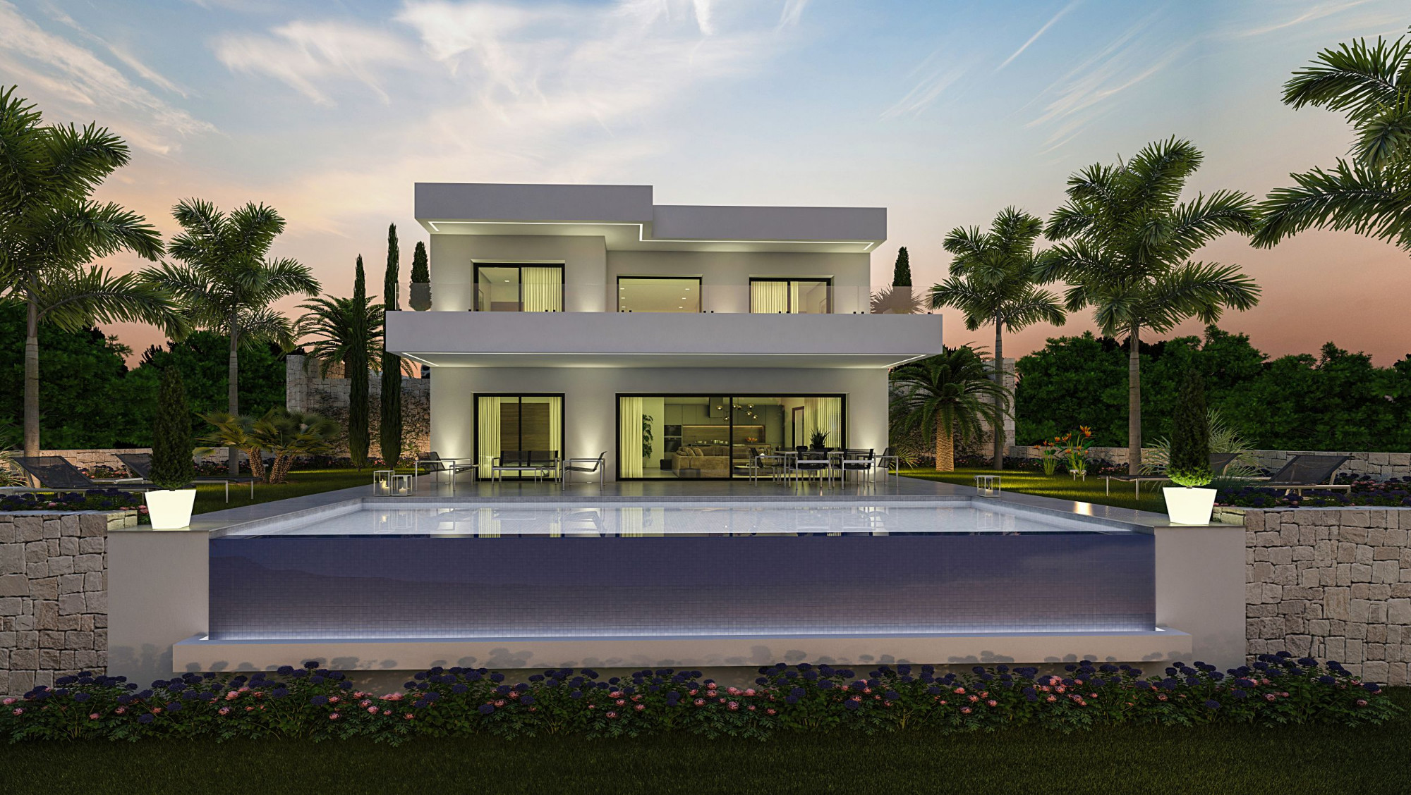 This modern design villa with sea views is projected on a beautiful south-oriented plot within walking distance of the center of Denia and all amenities. The house will consist of 2 floors with a modern open entrance with loft on the top floor, 2 bathrooms and 2 bedrooms, both of which have access to a spacious terrace. On the ground floor, accessible by a modern staircase, there is a large living dining room with open kitchen with cooking island and direct access to the covered terrace, sun terrace and swimming pool with overflow. On this level there is also a utility room and the third bathroom and bedroom which also has access to the pool terrace. From all rooms of this house you have a beautiful view of the Montgo and the sea. The house will be delivered turnkey, including solar panels, underfloor heating, air conditioning (hot / cold), electric shutters, parking with automatic gate and garden landscaping.