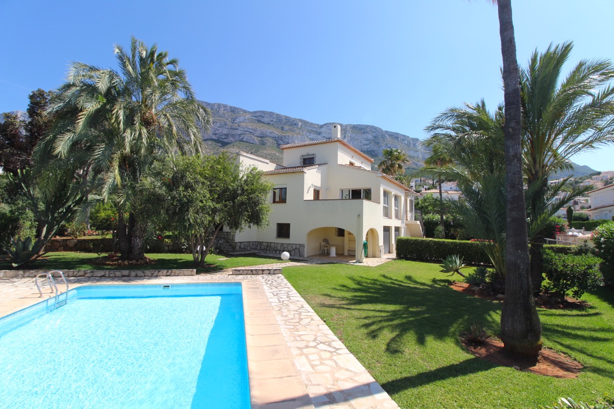 Large villa on a spacious plot with beautifully landscaped garden and swimming pool in a quiet residential residential area of Denia, ideal to live all year round because of the peace, sun and lovely sea and Montgó views. The house has a built surface of 350 m2 and is spread over three floors, all accessible by an internal staircase. On the ground floor is an entrance hall, a spacious living dining room with access to the terrace, kitchen with pantry and access to another terrace with barbecue, 3 bedrooms and 2 bathrooms. Upstairs you will find the master bedroom with en-suite bathroom, 1 study and 2 terraces with beautiful views of the sea, the castle and the Montgó. In the basement is a large double garage, gym, living room, kitchen, 1 bedroom, 1 bathroom, sauna and whirlpool room. Definitely worth a visit!