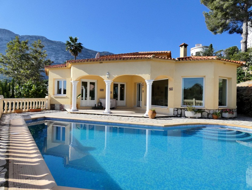Ideally located villa with 3-bedrooms and 2-bathrooms, sea and mountain views, just a 5-minute drive to the center of Denia. Built in 2000, this villa benefits from sunshine all day. Some steps lead from the carport to the main entrance. We are greeted by a large open plan living-dining-kitchen area. The living area benefits from a log burner and panoramic views. The naya and the pool also have sea views. 3-double bedrooms, the master bedroom en-suite with a bathtub and shower and another bathroom with a shower. The property also benefits from air-conditioning and double glazed windows throughout the house.