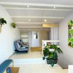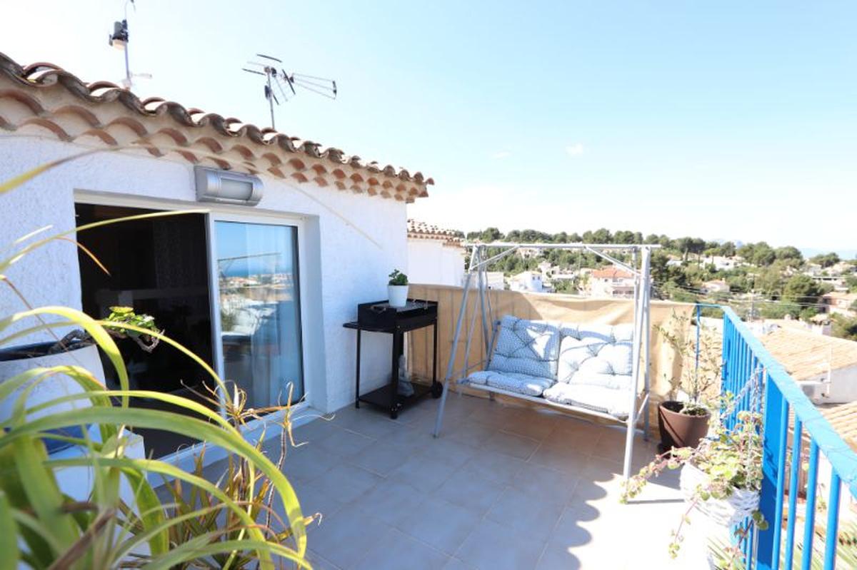 Romantic bungalow with sea view for sale in Denia. If you are looking for peace and quiet from your daily turbulences, this is the house you are looking for! In an elevated position with beautiful views to the sea and Denia, this bungalow is perfect to relax. It has sun all day and is very private. From the parking you walk a few steps through the garden of the urbanisation to reach the large uncovered west terrace which leads to the entrance of the house. On the left hand side we find the double bedroom with high ceilings which gives the possibility to create more storage space. Next comes the bathroom with hydro-massage bathtub. Continuing along the corridor and down one step we find on the left hand side the fully fitted kitchen and open to the living/dining room, where the pellet oven  heats the whole house including the upstairs thanks to the chimney pipe that goes up there. From the lounge you enjoy beautiful views of the sea and the sunrise. A staircase leads to the upper floor, which is open plan with space for a bedroom, wardrobe and office. It gives access to a 9m2 terrace with beautiful sea views. The whole house has double glazed windows and there are 2 air conditioners c/f. The electrical and plumbing installations are up to date. The walls are sound insulated and the ceiling is thermally insulated. The floor is made of high quality hard-wearing parquet. Underneath the house there is a storage room of 9m2 and from there the whole house can be accessed from underneath it. In front of the house there is another piece of garden.