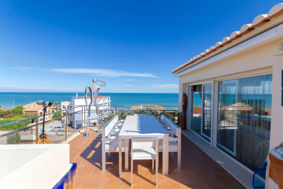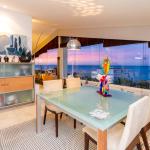 Penthouse property split over two levels with a total built area of 180 m2 and more than 90 m2 of terraces offering breathtaking sea views. On the top floor is a diaphanous living space with spectacular views comprising a living-dining room, a kitchen with central island directly overlooking an exceptional terrace with chill out area, jacuzzi and summer dining room. The master bedroom with terrace and dressing room as well as two other bedrooms with a family bathroom are on the lower level. The apartment is equipped with double glazing, central heating and air conditioning. In the sale are included a garage space, 2 cellars and two outdoor parking spaces. The residential complex offers beautiful community areas with swimming pool.