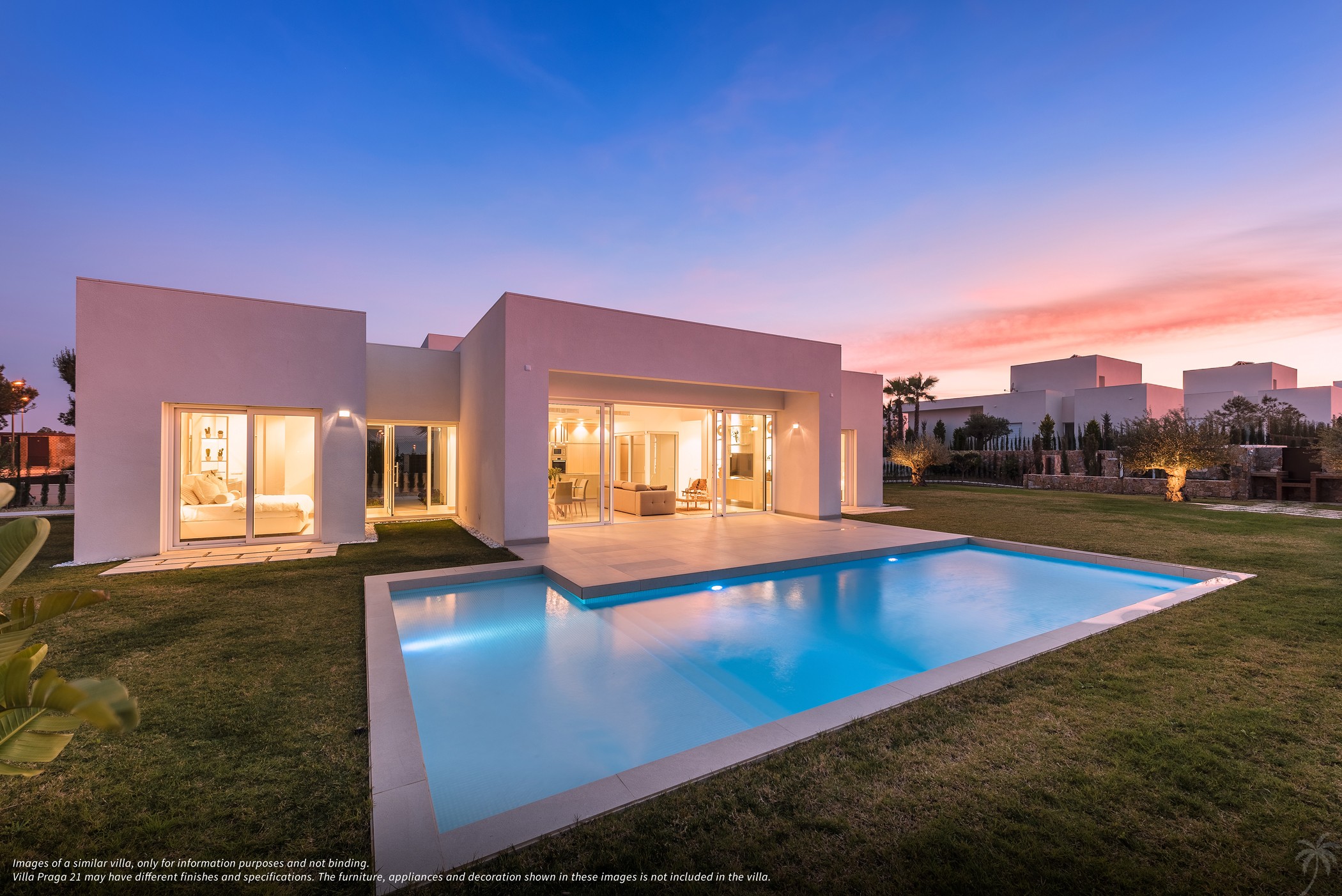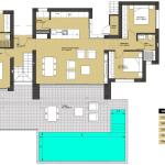 Beautiful new build villa in Finestrat. This beautiful spacious villa stands on a plot of 700 m2 and has a living area of 140 m2 and is divided into 3 bedrooms, 2 bathrooms, a modern open kitchen that overlooks the living / dining room. Outside you will find the private swimming pool and the tiled terrace. Under the house you will find a garage and an office space with toilet. The house is delivered key ready. Contact us for more information!
