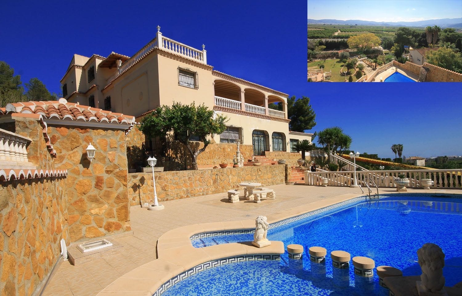 Te koop bij Villas-Plots: Een koninklijke 7 slaapkamer villa op 2500m2 gelegen op slechts enkele minuten van Gandía. Bestaande uit de entree / hal, ruime keuken met terras, een enorme 200m2 woon- / eetkamer met terras en zomerkeuken, 7 slaapkamers (waarvan 3 met kleedruimte en en suite badkamer en terrassen) en 4 badkamers. Het interieur is ruim en licht, elke kamer heeft een prachtig uitzicht op de bergen, van het dorp Ador naar de zee. Het buitengebeuren van het pand is ook onberispelijk, met meer dan 250m2 terrassen, een 7x11m zwembad met douche, berging en een bodega, een scala aan fruitbomen en mediterrane planten. Verder: volledig perifeer alarm, interne telefoon, intercom, centrale muziekinstallatie, airco en cv in het gehele pand, elektrische poort, dubbele garage met wasruimte, personeelsingang.