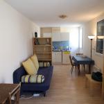 Indeling appartement (27 m2): leefruimte met keuken en badkamer, balkon, garage.