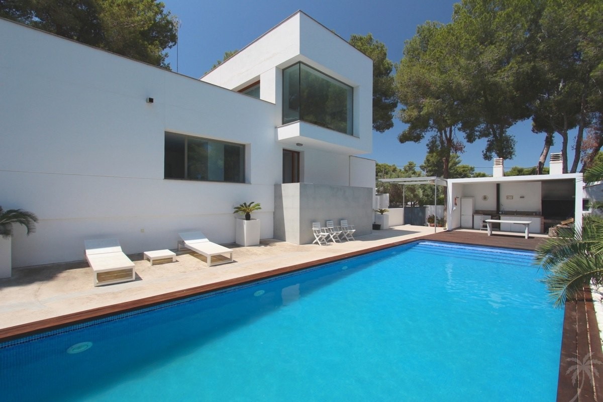 This modern villa with swimming pool and amazing view at the sea is located in a popular area in Javea only 1 kilometer distance of the Arenal sandy beaches. The house has 2 floors and offers the main accommodation on the ground floor with a dining area, open plan kitchen, master bedroom with walk-in closet and separate bathroom. On the first floor is a modern and stylish living room with adjacent to it a great terrace and huge windows that reach the floor to provide another amazing view at the surroundings. The swimming pool measures no less than 15 x 5 meters and is surrounded by a terrace and BBQ-zone .Last but not least, there is a garage suitable for 4 cars and storage room. This villa is sold completely furnished!