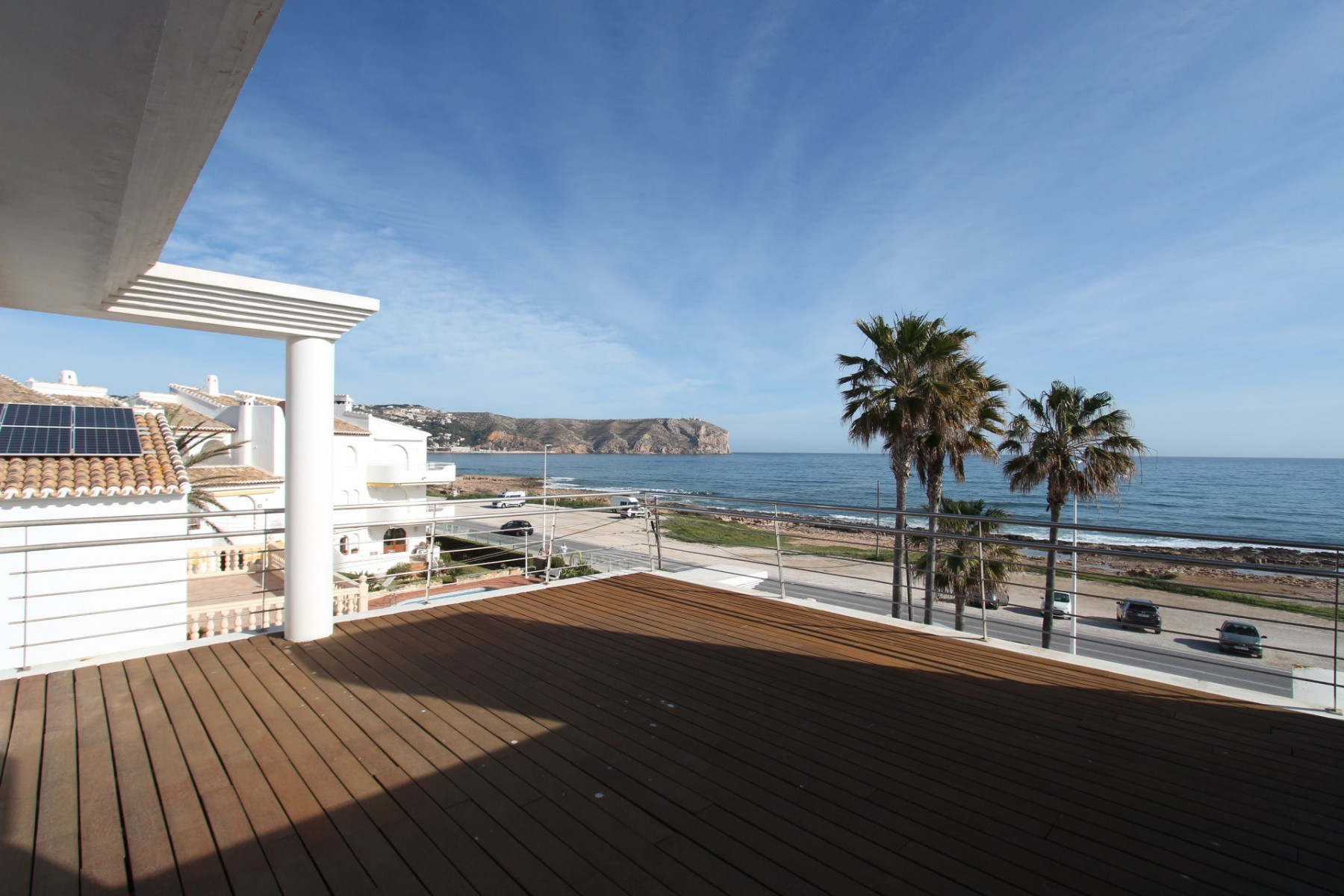 Duplex penthouse located in a luxury residential complex on the seafront in Jávea. The apartment of 130 m2 plus 70 m2 terraces consists on the main floor of an entrance hall, spacious and bright living/dining room with access to a magnificent terrace with completely open views of Cabo San Antonio and the sea. The kitchen is independent, fully equipped and also with direct access to the terrace. On this floor is a double bedroom with access to the terrace and a private bathroom. On the first floor there are two further bedrooms with en suite bathrooms, as well as two other terraces facing the sea. The apartment is installed with all comforts, including central heating, air conditioning, double glazing. The residential complex offers a communal pool, access to the sea on foot, and garage. This apartment is sold with a garage for two vehicles.