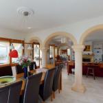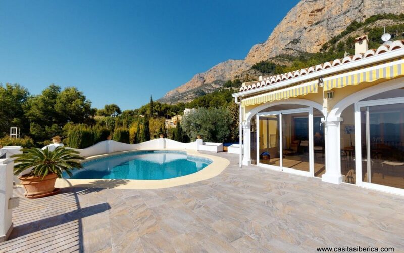 This 4 Bed villa with panoramic views is set in beautifully landscaped gardens and is situated on the upper slopes of the Montgo in Javea. The electric entry gates open to an impressive driveway with a car port and a single garage (small car). The front door opens into the entrance hall, to the left is the guest W.C., straight ahead double doors open into the large living room with fireplace, arches to the left give way to the dining room with direct access to the large fully fitted kitchen with walk in pantry and separate utility room. A hallway to the right of the entrance hall leads to the main guest bedroom with en-suite shower, a study (3rd bedroom) and the master suite with dressing area, large bedroom and a large en-suite bathroom. Double doors from the living room lead out to the glazed Naya which enjoys the spectacular views over the valley. Direct access from NAYA to POOL area with free form pool. On the lower level there is a separate guest apartment with living/dining area, kitchen, double bedroom and en suite shower room. There is also a gym, large store room and boiler room/workshop.