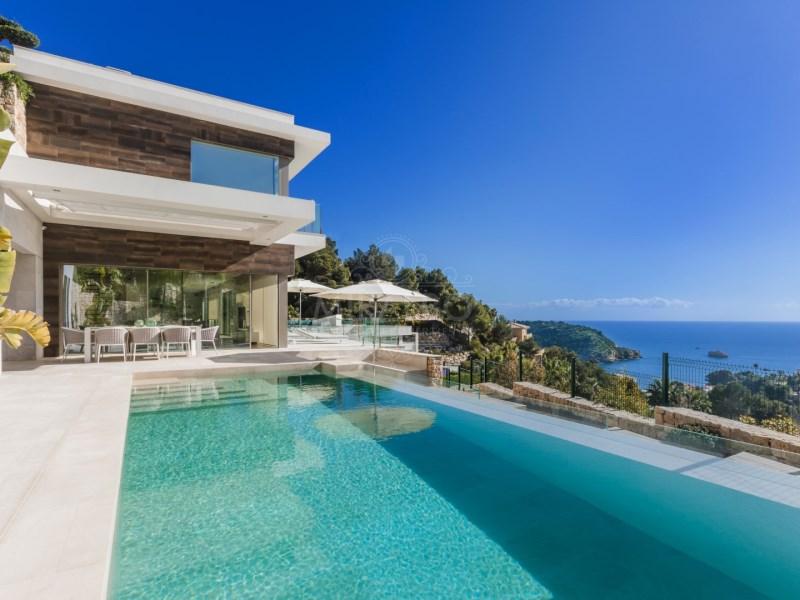This modern villa was built in 2016 in one of the most sought-after areas of Javea with spectacular panoramic sea and mountain views and close to the beach and restaurants.The house is designed over 3 floors which are all connected by an elevator and internal staircase. The main floor consists of a spacious open plan living-dining room with a modern fully equipped kitchen, connected to a large utility room, laundry, and technical room. All opened onto a large sunny outdoor terrace with panoramic views of the sea, the valley, and the island of Portichol. The outdoor area consists of large terraces and space to relax and entertain, the ideally located swimming pool with views overlooking the sea and the valley is surrounded by a built-in chill-out, as well as a barbecue area,  toilet, and a landscaped Mediterranean garden with palm trees and fruit trees. Upstairs are 4 generous bedrooms and 3 bathrooms, including the beautiful Master suite with a walking closet and en-suite bathroom. All bedrooms enjoy stunning sea views. Using only the best qualities of finishes such as KRION, Porcelanosa, double glazed aluminum window, underfloor heating, integrated air conditioning, lift, Bose music system inside and outside the house, domotic. The property benefits from a shaded carport for two cars. Just a few steps from two fantastic beachfront restaurants, this villa is a fabulous place to live or visit.