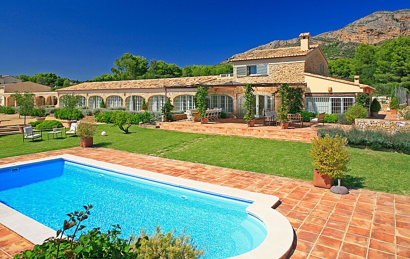 Magnificent south-facing rustic finca completely restored and with views of the Montgó and the valley in Jávea. The main house comprises a living room, fireplace, kitchen, 3 bedrooms, 3 bathrooms, a toilet. In addition to the main house, there are 3 independent apartments, 2 consist of a living room, kitchen, 2 bedrooms and 1 bathroom, the third has a living room, kitchen, 1 bedroom and bathroom. The villa has beautiful stone walls and is installed with central heating and double glazing. It also has a covered and uncovered terrace and a beautiful garden on a flat plot with swimming pool. The property is located in a natural and private environment close to the Montgó Natural Park.