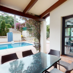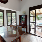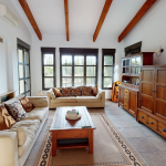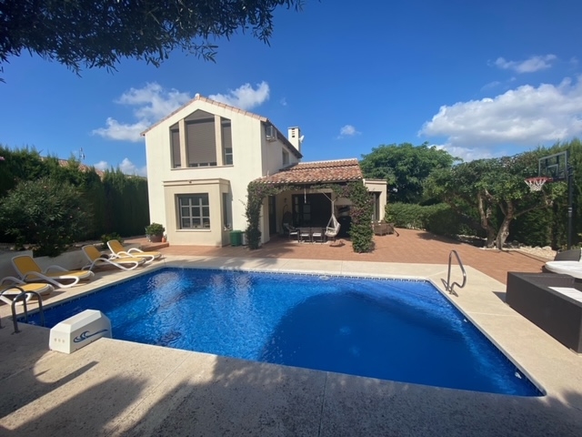 This villa was built in 2006 on a sunny corner plot with private pool, terrace and garden close to the golf course of Javea. A few steps from the double carport lead down through the garden to the main entrance of the house. A living space of 176 m2 is divided over two floors. Stepping into the hallway we find a guest toilet, a separate kitchen with dining area and with adjoining utility room, a master bedroom with bathroom en-suite, a living/ dining area with floor to ceiling windows and feature fireplace. Patio doors lead onto the charming pool terrace with a covered seating area providing a spacious shady area to relax or dine whilst enjoying the views. Internal stairs lead up to a single bedroom, a large double room and a further bedroom suite with shower bathroom and an impressive view to the Montgo mountain. A family bathroom with jacuzzi tub and shower fitting is also provided. A generous and private plot surrounds the property with tall trees providing privacy throughout. The lawned area to the rear offers further space to relax or for children to play in complete safety.