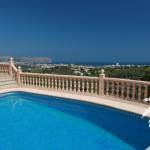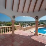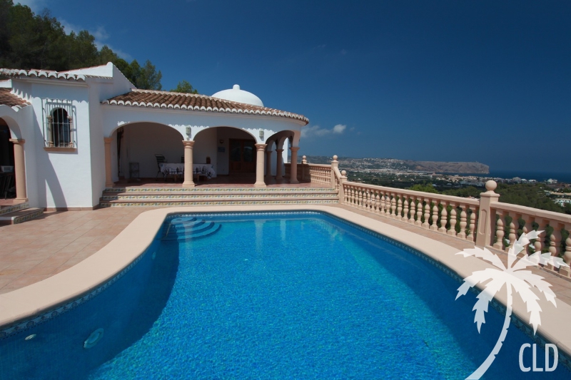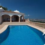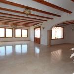 Villa with open sea views in Javea, Costa Blanca. Large covered terrace with Tosca stone arches overlooking the pool and facing the sea, spacious lounge with fireplace, dining room, large kitchen, four bedrooms and three bathrooms, toilet. Underfloor heating. Hot / cold air conditioning in lounge and master bedroom. Sauna. Beautiful 10×5 pool. Lower floor: living room, kitchen. Central heating.
