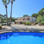 Dubbele glazen deuren leiden naar open terrassen en de tuin, die leiden naar de terrassen bij het zwembad, een groot niervormig zwembad van 12 x 5 meter, met Romeinse treden en het barbecuehuis.