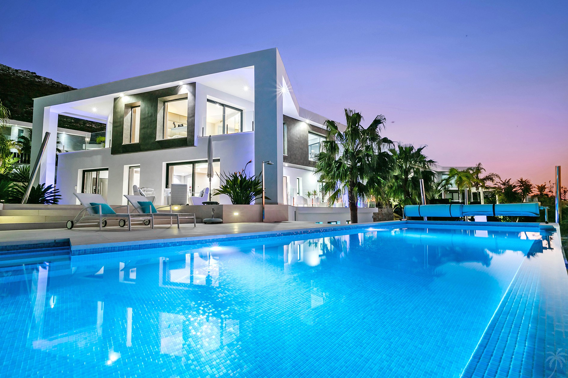 This stunning contemporary villa was built by the current owners, being completed in 2014. The striking property is located on a gently sloped plot of 1,500m² boasting stunning open valley view’s spanning from the church of Benitachell, taking in the sunset and the Montgó to the sea in the East. With 364m² of living area featuring 4 double bedrooms all en-suite, the property boasts many high-end features such as an Italian designer Kitchen, Gym and Spa area and many luxurious outside spaces all enjoying a breath taking panoramic view of Javea. The Villa is distributed over three floors with the living area, terrace spaces and one en-suite bedroom being on the main level. This opens onto the heated pool and terrace area surrounding the property, offering plenty of space to chase or evade the sunshine, as well as a summer kitchen and BBQ area. An internal staircase takes you to the first floor which consists of three double bedrooms, all with en-suite bathrooms and separate private terraces enjoying great sea views as well as of the beautiful landscapes of Javea including the majestic Montgó mountain and the stunning sunsets. On the lower level you find your personal Gym and Spa area which features a heated Jacuzzi, infrared sauna, relaxing lounge area and separate access to the outdoor pool and garden areas, which are automatically irrigated. Featuring a huge specification list, this luxury villa is also equipped with the latest technology including a domotic system, hot and cold inverter ducted air conditioning which is controlled individually in every room, under floor heating, top quality double glazed windows and doors, ceilings with indirect LED lights, the latest alarm system and electric blinds. Tastefully and elegantly decorated and furnished this gorgeous villa really requires to be seen to be truly appreciated.