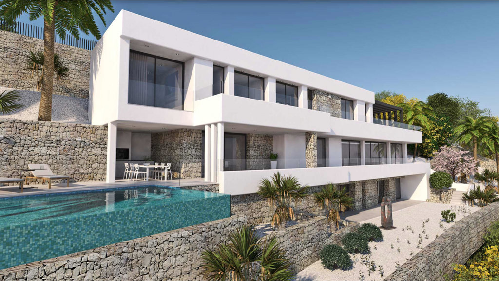 Modern luxury new build villa with sea view for sale in Javea, located in the exclusive area "La Corona". The project has the license to start construction and can be realized within 14 months. On the ground floor there is a spacious living room with a large, open and fully equipped kitchen from which you can go to the terrace. On the first floor there is a master bedroom with en-suite and private terrace, and 2 more double bedrooms that share a family bathroom. On the ground floor there is a fitness room, 2 double bedrooms that share a family bathroom and a laundry room. The layout can be changed slightly to your own taste, from almost every place in and around the house you have a spectacular view of the harbor and the bay of Javea.