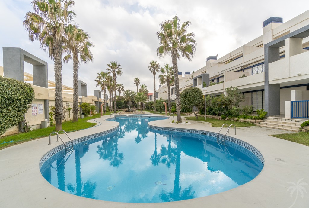 Unique apartment with a privileged location, located on the beachfront in Molino Blanco, 20m from the beach. 1st floor, facing east, has 2 bedrooms, 1 bathroom, two terraces (east-west), living room with fireplace, equipped kitchen, front terrace with views of the sea and the beautiful communal garden. Residential with swimming pool and communal solarium for sunbathing and relaxing, social club. Located in a quiet area with several restaurants, supermarket, other services.