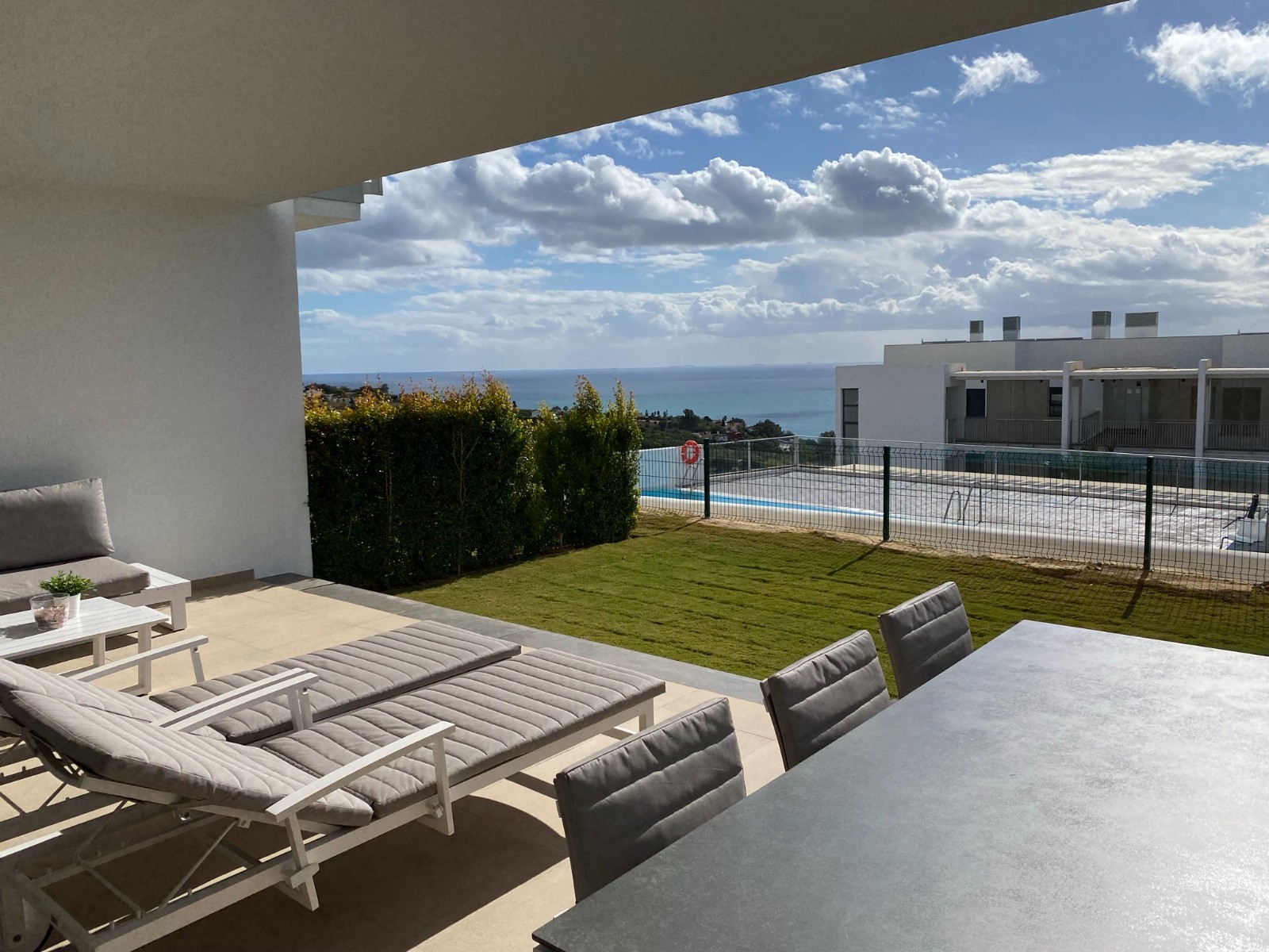 Unique opportunity. This apartment is for sale completely furnished. The previous owners have only spend 2 months in this apartment. This 2-bedroom apartment is situated on the ground floor, which gives it the benefit of a large terrace and garden for private use. From this apartment you overlook the pool, the Mediterranean sea and the mountains. Thanks to its southwest orientation you receive a lot of sun, and below the covered terrace you can sit outside even at the colder & windier days. The spacious living room with open kitchen has everything you need, high-quality appliances, designer furniture and lots of natural sunlight. The large TV comes with a chromecast to stream your favorite channels and videos. There is WIFI lightinng which you can adjust with an app on your phone. Both rooms are equipped with double bed and large built-in wardrobes with fitted drawers. Also great rental possibilities. Would you like to receive more information about this key-ready apartment? Please feel free to request more information!