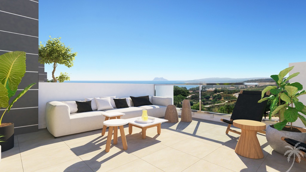 Offering a view like no other, this is a unique development of 47 contemporary Manilva town homes, some with private gardens and others with a fabulous solarium. Just five minutes from some of the best golf courses in the area including the world famous Valderrama in Sotogrande. It’s all about location and these prime properties are perfectly positioned for enjoying the luxury lifestyle of the Costa del Sol with the luxury resort of Marbella and the lovely port town of Estepona around 20 minutes away. The chic three and four bedroom contemporary Manilva town homes are designed to make a statement. They feature clean lines and are light, bright and airy allowing natural light to flood in throughout. An open plan lounge and dining area and fully fitted kitchen with garden views with large glass doors leading out onto a generously proportioned private terrace where dining alfresco will be the norm. A clever use of natural tones and textures throughout add to the high quality modern feel of the design. Bedrooms feature fitted wardrobes and the spacious master bedroom has a stylish en-suite and hidden dressing area with doors that open out onto a balcony enjoying spectacular views out to the Mediterranean and Gibraltar. Up on the roof terrace you can enjoy more fabulous views and relax in privacy soaking up the Spanish sunshine. The location of this stunning spot provides a peaceful and relaxed way of life and the beautiful beaches of this stretch of the Costa del Sol can be accessed by a footbridge. Ideal for cycling, long walks and of course golf.