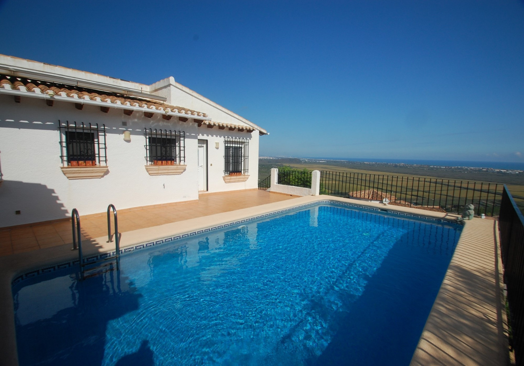 This villa is located in the quiet urbanization of Monte Pego, has a wonderful sea and panoramic view and is in good condition. It is about 5 km to the center of Pego / El Vergel, 8 km to the sea and 16 km to the port city of Denia. The house has 2 bedrooms, 1 bathroom, a toilet, a spacious living and dining room, an open kitchen, on the ground floor and a laundry room, a spacious storage room and a glazed terrace in the inferior floor. Outside there is a covered terrace, a lot of open terrace, an 8x4 m pool, an outside shower (w / c) and a garden. The house has many extras, such as: solar-powered central heating with radiators, a wood fireplace with cassette insert, an electric water heater, double-glazed windows with PVC frames, security bars, shutters and mosquito nets. There are also: satellite TV with satellite dish, built-in cupboards, carport for a car. The house is sold with electrical appliances and furnished.