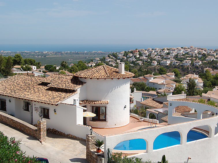 Beautifully situated detached villa with panoramic views over the Mediterranean Sea. There is a main house at the same level of the pool terrace that consists of an entrance hall, dining room with high ceiling and access to the covered terrace (naya), a round dining room and an open plan kitchen with access to the pool terrace and barbecue. On the other side of the living area is a hallway that leads to 2 guest bedrooms that share a bathroom and the master bedroom at the end with its own bathroom. In addition, there is a guest apartment in the underbuild and the property has an easy to maintain garden.