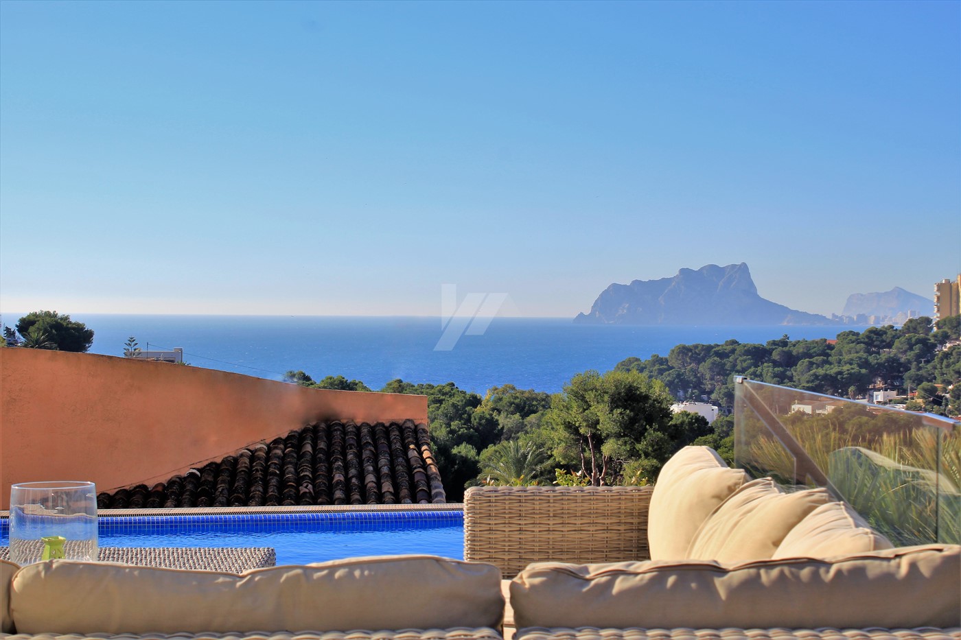Sea view villa for sale in El Portet, Moraira. This beautifully presented villa is distributed over two levels linked via internals stairs and is set on a levelled plot locate in a quiet cul-de-sac within the El Portet area at just a short distance to all amenities as well as the town centre with its sandy beaches and coves. Access to the property can either be made via the electric sliding gate that opens to a driveway leading to the double garage, or via the pedestrian gate opening to a paved path that leads to the main entrance of the villa. Entering the front door we are welcomed by the bright lounge area with its fireplace followed by the designated dining area and the open plan, fully equipped kitchen. On this level we also find two double bedrooms and two bathrooms with shower, on of which, en suite. The internal stairs lead to the lower level where we find an additional lounge area, two double bedrooms and a bathroom with shower and jacuzzi. On this level we also find the utility room, storage room and the internal access to the garage. Outside we find the lovely infinity pool with its large terraces enjoying beautiful views of the Mediterranean sea. The gardens surrounding the property area mature and easy to maintain. The property includes under floor heating, Hot and cold air-con, garage, Double glazing, storage/utility room, fireplace, security door, etc.