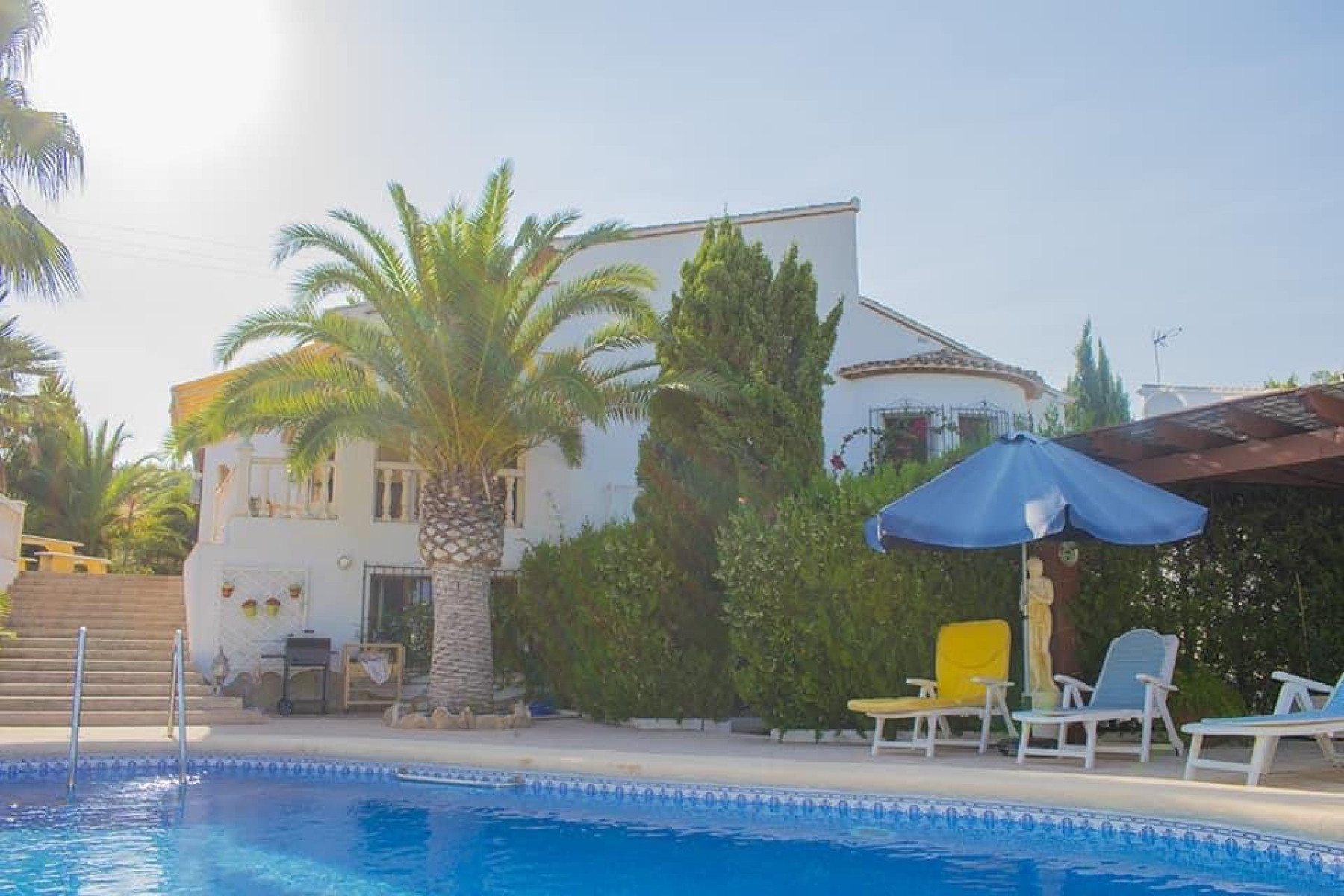 This south oriented 3 bedroom villa is located just 20 minutes walk from the beach and center of Moraira. The living area is on one level and features a large living dining room with front covered naya which overlooks the private pool and mature garden. The master bedroom with its own bakdamer also has access to the naya. In addition there are two guest bedrooms on this level, as well as a further bathroom and the fully fitted kitchen. On the lower level of the property there is a 130m2 underbuild which could be converted into whatever you wish. The property also benefits from electric gates, a fireplace, ample parking and gas central heating.