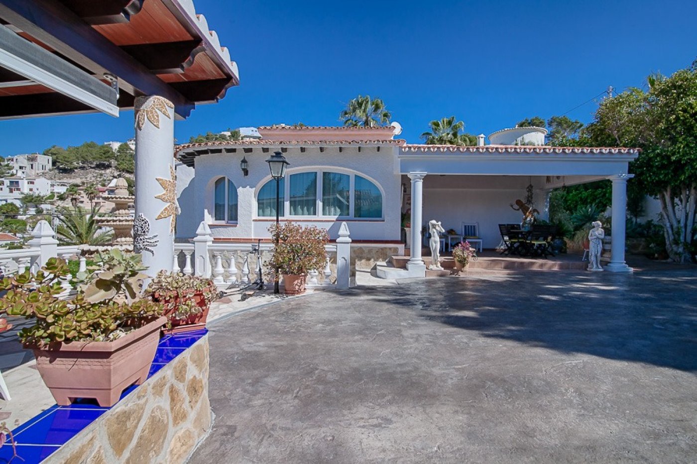 This charming villa is located in Moraira and has a lovely view over the mountains. The nearly 200 m2 built surface of the house is distributed over 2 floors. On the main level you find a large living / dining area with open kitchen and 2 double bedrooms sharing a bathroom. On the lower level is a separate studio with a bedroom and bathroom. Outside there is a large naya, several terraces, a large outside kitchen with barbecue, a uniquely shaped swimming pool and a beautiful garden.