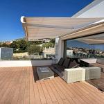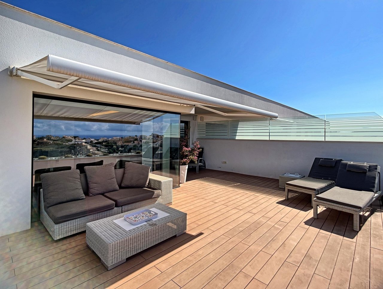 Modern sea view penthouse built in 2014 in a small complex within walking distance of the Pepe la Sal supermarket and a few restaurants in the residential area of Cumbre del Sol. The apartment has a living area of 113m2 and a private terrace of 50m2 with beautiful sea views. In addition, there is a covered parking space. The master bedroom is very spacious and has its own bathroom. From the living area with open kitchen you have access to the terrace through large sliding doors. The apartment has automatic shutters and lighting, air conditioning and heating. There is also a heated indoor pool with sauna, toilets and terrace overlooking the garden.