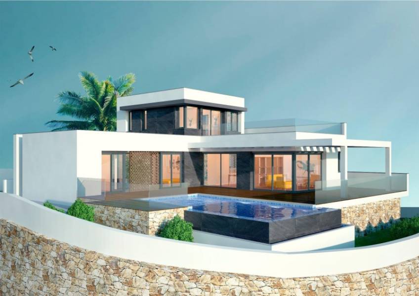 Very large modern villa with sea views. This villa consists of 4 floors. The main living floor has a spacious living/dining room with access to the pool terrace, a very large kitchen, two double bedrooms with built-in closets and access to the terrace; both bedrooms share a bathroom with walk-in shower. On this floor, there is also a guest toilet. On the second floor, you find the master bedroom with en suite bathroom, a walk-in closet, and access to a private sun terrace. Beneath the main living floor, there is a large underbuild with space to create another 3 (bed) rooms and where the garage is located. From here there are stairs down to the basement. Extras: several suns and covered terraces, 8x4m swimming pool, double glazing, underfloor heating, basement for storage and an off-road parking spot.