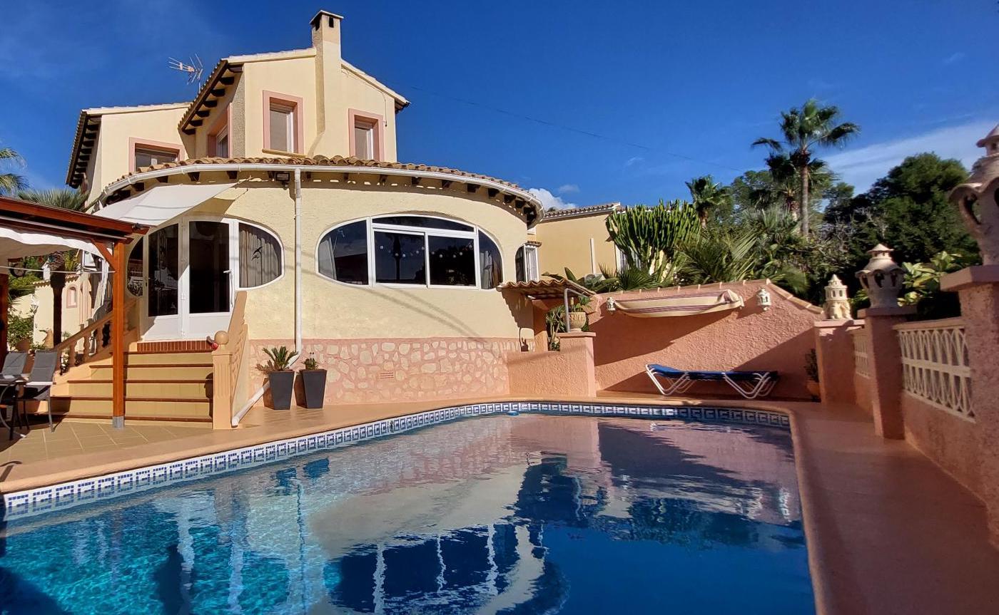 Villa located, in the Montemar Urbanization, within walking distance from the beach. The villa has two independent living spaces. On the ground floor we find the main house with two bedrooms, a bathroom and a shower, independent kitchen, living room, and a large sunny covered naya, a large garden very careful with native plants and a pool. The first floor is accessed by a completely independent entrance through a staircase. Nice open views, this completely independent apartment is distributed in 2 bedrooms, 1 bathroom, kitchen living room included. Exterior space to park two cars and a garage.