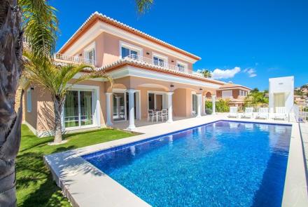A luxury new build villa for sale in El Portet Moraira, commanding panoramic sea views, not far from the idillyc El Portet Beach. From the double garage, the lift takes you up to the pool terrace. The main floor comprises of a large living-dining room with direct access onto the covered terrace, boasting panoramic and sea views. Fully fitted kitchen with breakfast bar. Also found on this floor a guest WC, laundry area and a master bedroom with en-suite shower room. The top floor of this new build villa comprises of three double bedrooms, one of them incorporating an en-suite bathroom and dressing area as well as a private sun terrace. The other two double bedrooms share a family bathroom. Outdoors, there is a large terrace around the pool, and easy to maintain garden with irrigation system. The specificacions include: Electric gates, Intercom, Dry stone walls, Lift, Security Door, PVC double glazed windows, Air Conditioning, Underfloor central heating, Fully equipped Kitchen, Wide Wooden Internal Doors and much more...
