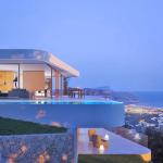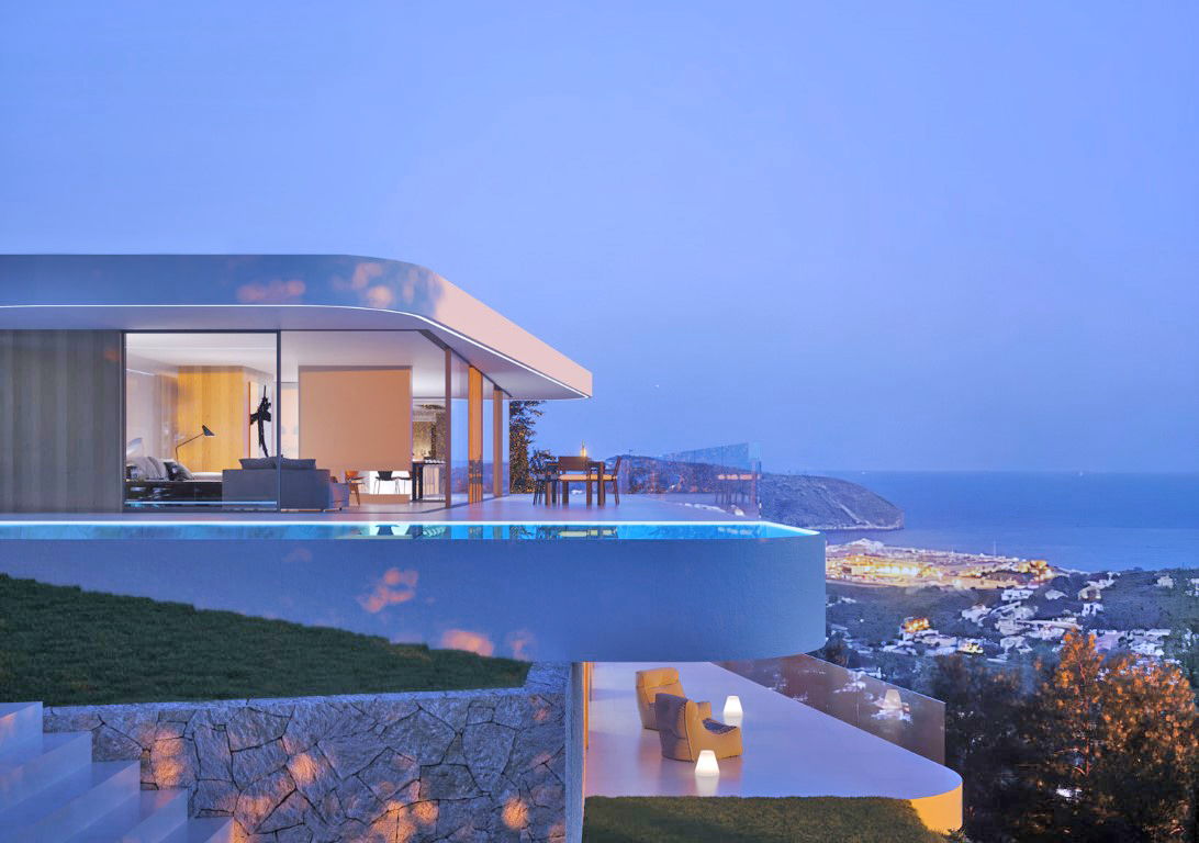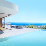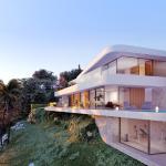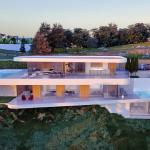 De villa is geïntegreerd in het terrein en omhelst het met meerdere niveaus, waardoor maximale privacy mogelijk is. De open terrassen hebben twee overloopzwembaden en één heeft een geïntegreerde jacuzzi. Ze kijken allebei uit over het panorama uitzicht op zee en de bergen.