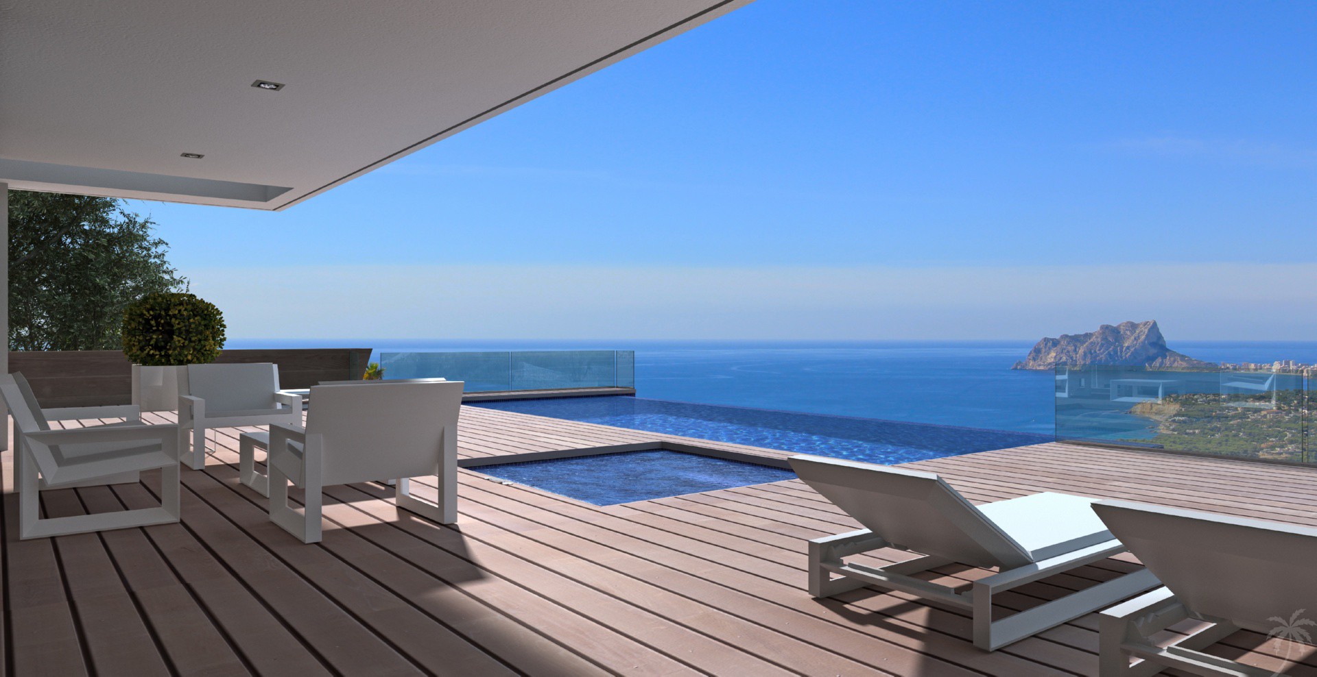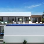This modern villa stands out for its exterior design, a combination of clear lines and embellished elements that provide a unique, modern and elegant style. Not forgetting about the villa’s spectacular views across the Mediterranean Sea towards the Ifach Rock.Its layout also deserves a special mention, as the main home is situated on only one floor, which makes it ideal for those who do not want to use stairs. On this floor there is a spacious entrance hall, three bedrooms with en-suite bathrooms, one of which, the master bedroom, also houses a walk-in wardrobe and has direct access to the terrace. The spacious kitchen is connected to the lounge and a sunny veranda, where you can enjoy the fresh air and, in turn, leads on to the terrace with the infinity pool and a Jacuzzi. The layout of this floor also includes a guest toilet and a laundry room. On the lower floor we find the garage with room for 3 vehicles and a space of 24,90 m2, with a terrace and a porch with a surface of more than 100 m2, which can be adapted to the needs of each client, so its use can range from a guest apartment to a leisure and relaxation area, with a home cinema, indoor pool, sauna etc., a 100% customizable space from which the wonderful views of the Mediterranean Sea can be enjoyed.