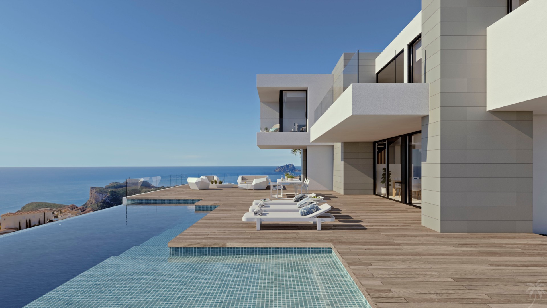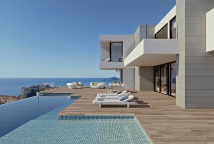 This villa is a unique property that follows a modern aesthetic line, with several terraces and viewpoints to contemplate the sea and let the light from the Mediterranean sun flood its interior from sunrise to sunset. It has spectacular sea views that can be enjoyed from the entire house, and especially from the impressive pool whose access emulates a beach and its impressive infinity that plunges us into the sea. The ground floor draws attention, with its spacious rooms, a gourmet kitchen with central island and breakfast bar, connected to the porch, the living- and dining room, all rooms with direct access to the terrace and of course with sea views. It has 3 bedrooms and 4 bathrooms. The main bedroom has a large dressing room, a bathroom en- suite and a private terrace. On the lower floor we find a diaphanous space with porch and terrace, which allows to expand the house in number of bedrooms or for what the owner's wants. Complete the set the terraces and outdoor areas, designed to live outside, to enjoy the Mediterranean climate and its placid views of the sea.