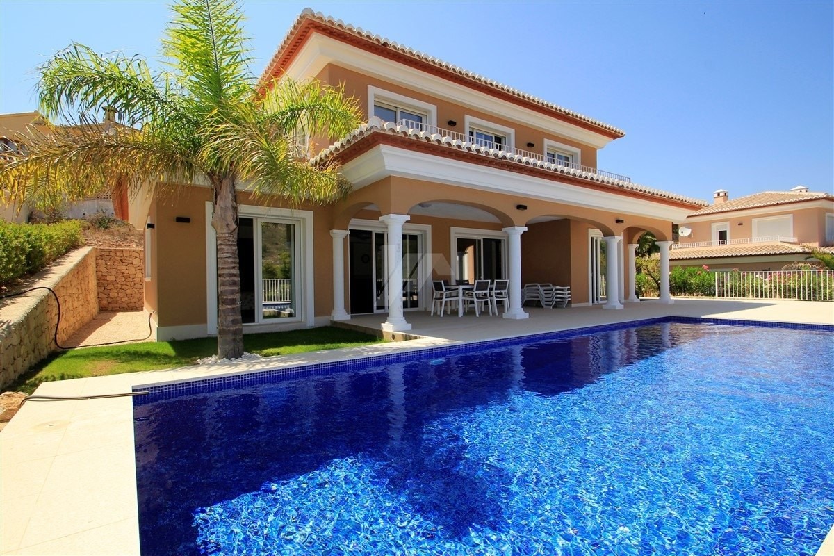 Luxury new build villa for sale in Moraira, Costa Blanca. This beautiful classic new build is distributed over two levels linked via internal stairs and has been built to the highest standards and finishes. Set on a completely flat, elevated plot within a tranquil area of Moraira just a short drive to the El portet beach, the villa enjoys beautiful mountain views towards the Mediterranean sea. Access to the property is made either via the pedestrian gate opening to a few steps or via the double garage where we find the lift taking us to the entrance level of the villa. Entering the security front door we find an ample entrance hall followed by an inner hall where we find the guest toilet and the utility room, further on the ample lounge/dining area with fireplace and glazed sliding door leading to a covered porch by the pool area. On this level we also find the separated fully equipped kitchen with breakfast bar and glazed sliding doors leading to the pool areas and a master bedroom with dressing room and en suite bathroom. The internal staircase leads to the upper level where we find two double bedrooms with fitted wardrobes sharing a family bathroom and another master bedroom with a sunny balcony, dressing room and en suite bathroom. There is also a storage room on this level.