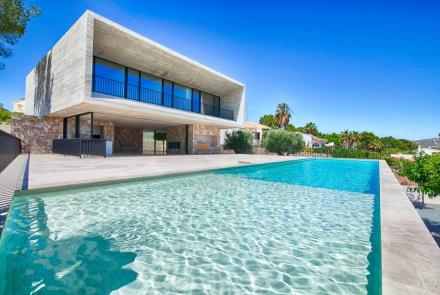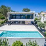 Impressive modern new built on 3 levels with a total built area of 6262m2, on a 929 M2 plot, facing south only 1500 meters from the beach, restaurants, supermarkets and the center of Moraira. This villa is a technically advanced concrete construction in all facets. The top-floor looks like flying in the air because of the Incredibly large overhangs. On top of that, the villa has an energy certificate with an A-rating. The quality of the entire house starts with the massive floor to ceiling safety door which brings you in an open hallway. From here you will see that the entire lower level is one open space having no inside doors except for the guestroom. Like everything in the villa, even the guestroom is a special design with full contact with the outside. The hallway with minimalistic iron stairway flows over in the living room, having a salon with wood-burner, dining area and open kitchen with high-class appliances. A high-end ventilation system under the floor guarantees fresh air throughout the whole day. By the advanced domotic system, almost all functions can be managed remotely. The sliding doors to the terrace disappear in the wall when you open them. The terrace is equipped with a big swimming pool and an outside kitchen. On the first floor, you will find 4 bedrooms with 3 bathrooms all having access to a big covered terrace on the south side. On this level, you will find a big patio. In the basement, there is a garage for two cars, accessible by an electric gate. The landscaped garden is low maintenance.