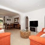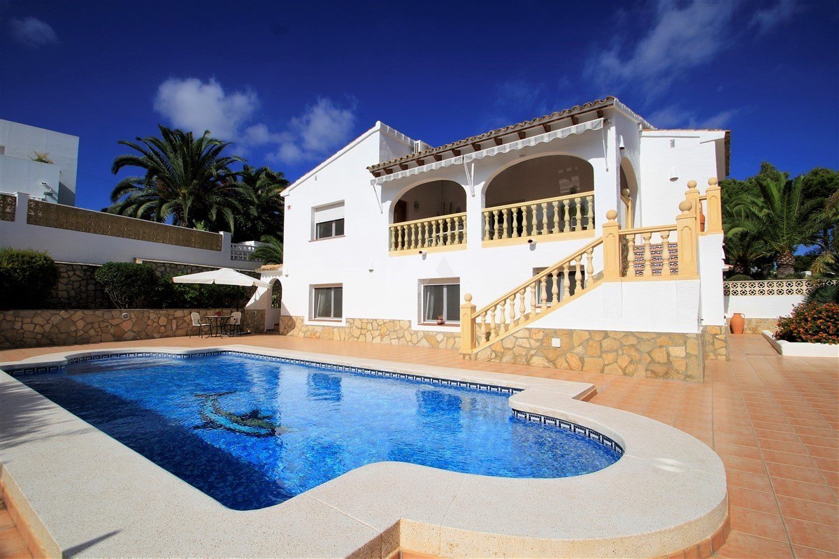 This large immaculate 6 bedroom villa for sale in Moraira is situated on a flat plot just 600m from the beach and 500m from amenities.  Entered via either a sliding door leading to a driveway and garage or pedestrian gate with pathway through the landscaped gardens leading up a few steps to a covered porch. From here a door leads to the large reception room with a Tosca stone archway to the dining area which has double doors leading out to a spacious covered sun  terrace with ample space for dining and relaxing.  To the right is a spacious fully fitted kitchen with wall and base units, integrated electric oven and hob.  To the right of the lounge an archway leads to an inner hallway off of which are 2 double bedrooms, both with fitted wardrobes,  a guest shower room and cloakroom.  A further archway off of the lounge leads to a large master bedroom with fitted wardrobes to one wall and door to the sun terrace.  From the sun terrace a few steps lead down to a huge terrace surrounding an 8 x 4m swimming pool.  To one end is a BBQ with fridge, adjacent is an outside toilet. On the lower level, there is a guest apartment with independent access consisting of a fitted kitchen with granite worktops, a lounge/dining-room, 3 further double bedrooms and a large guest bathroom. The plot is level with low maintenance gardens, ample terracing, outside lights, irrigation system and garage with tiled floor housing the washing machine and boiler. Extras include: full gas central heating, partial hot and cold air-conditioning/ceiling fans, full double glazing  with mosquito nets and persianas, satellite TV, alarm and garage.