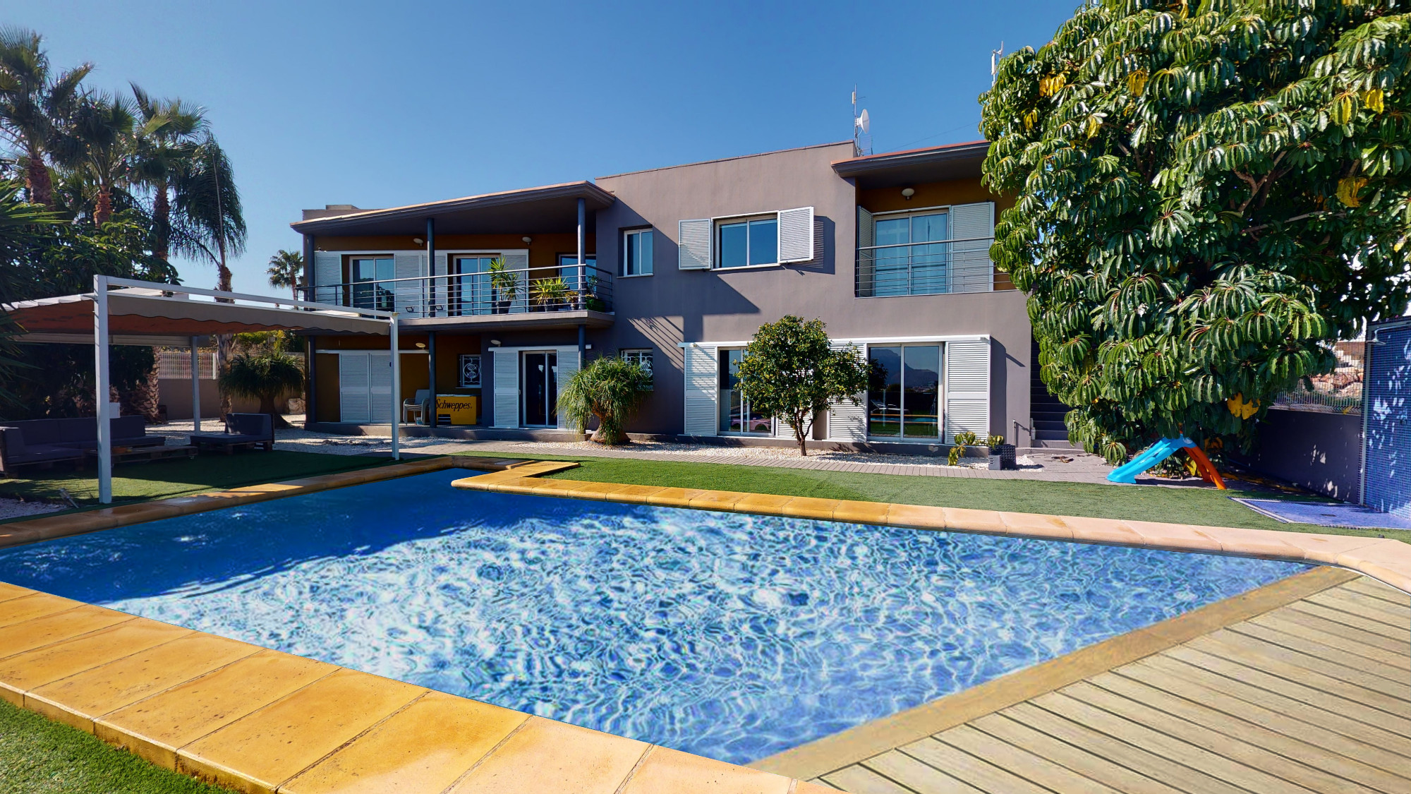 This modern villa is located in a quiet residential area in Beniarbeig within easy walking distance of the town centre with all services. It is 7 km to the sea and 10 km to the center of Denia. The property was built on 2 levels and is in very good condition. On the ground floor there are 2 bedrooms, 1 bathroom, a living and dining room, a closed kitchen, as well as a covered and an open terrace. An internal staircase leads to the inferior floor with 3 further bedrooms, a dressing room, 2 bathrooms, another living and dining room and a laundry room. The villa has a fantastic panoramic view of the sea and the mountains and has many extras, such as: 7 units of air conditioning (h / c), central gas heating with radiators, double-glazed windows, sun blinds, alarm system, built-in wardrobes and satellite TV with satellite dish. In the idyllic outdoor area there is a breathtaking 4x10 m pool with outdoor shower, summer kitchen, BBQ and a carport for 3 cars. The villa is being sold furnished and with electrical appliances.